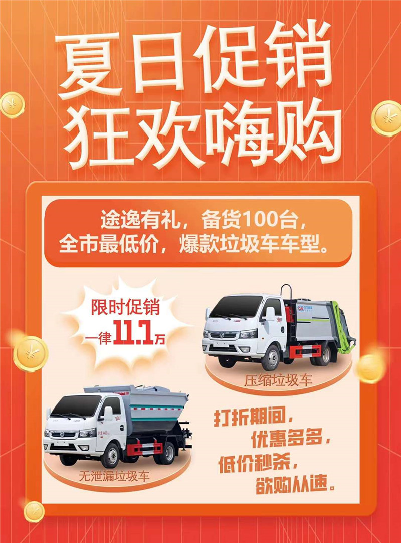 程力環(huán)衛(wèi)垃圾車廠家為提升單品發(fā)行量,搶占全國環(huán)衛(wèi)車市場,特備貨100臺東風途逸無泄漏垃圾車和壓縮垃圾車。夏日促銷,狂歡嗨購。