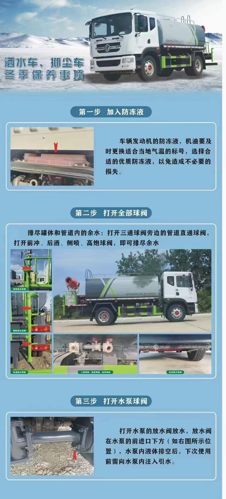 當(dāng)氣?溫低于?零度時(shí),應(yīng)及時(shí)?打開灑水車所有管道閥門,排盡灑水車罐?體及管道?余水,并使球閥保護(hù)打開狀態(tài),防止?管道、球閥凍?裂。