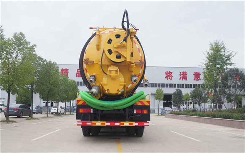 這款車的上裝配置了碳鋼板材,其中罐體前段為清水罐約4方,后段為污水罐,兩倉球閥互通。罐體尺寸為4700mm×1800mm。兩倉中間用封頭,通潔250流量高壓清洗泵,配60米高壓管。安裝山東美卓30方水環泵帶375馬力新副發。卷盤裝后封頭180度旋轉,后封頭液壓打開。后封頭上一個500水泥蓋放污,可液壓開啟,側面一個6寸強排閥,后封頭一個6寸出口,一個6寸進口,罐內半鋪不銹鋼,防溢流報警器,駕駛室頂部警燈,罐體尾部箭頭燈,油水分離器,帶一個視污窗口和帶8米吸污管。