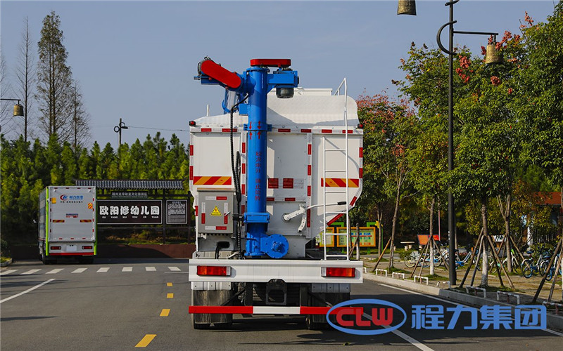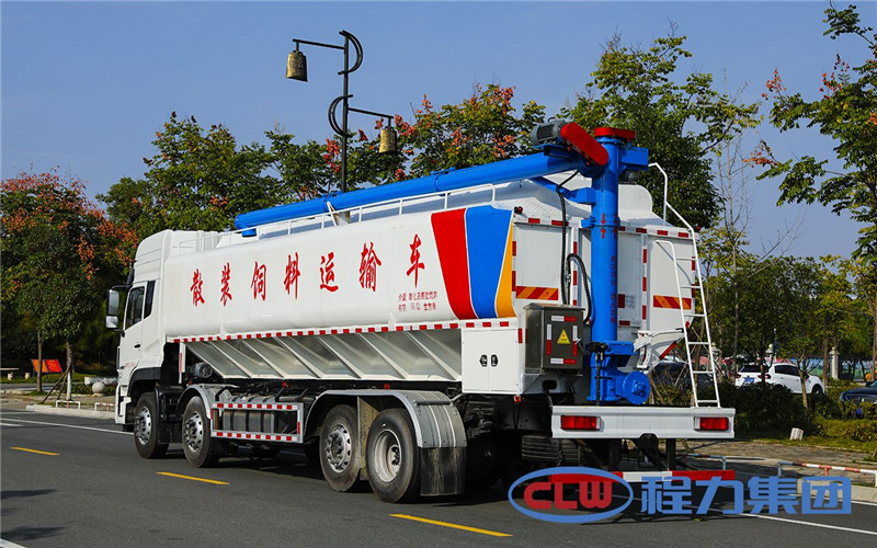 散裝飼料車的飼料罐架設在卡車的底盤上,罐頂開有進料口.頂部的一根螺旋輸送卸料管(俗稱卸料絞龍)則可自由回轉和抬升,抬升的仰角可達60度。運輸時,頂部的螺旋管平臥在罐頂;卸料時則抬起,使管端的出料口與畜禽飼養場貯料罐頂部的進料門相接,駕駛室內裝有操縱裝置,卸料時通過車底的動力輸出軸和減速器來驅動螺旋,以完成卸料。目前國內主要推出3T、5T、8T、11T、15T和22T等多個噸位車型。