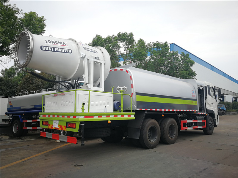 東風天錦抑塵車主要結構是在行走機構上加裝方型大容積水罐、高效遠程霧炮系統、大功率專用自吸自排水泵,中低壓沖洗灑水系統、綠化灑水高炮(可選裝自動灑水高炮,在罐體前端)等等而改裝組成 罐體容積大(方罐容積12立方),免征產品。