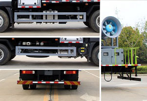 專用裝置為抑塵霧炮,用于城市抑塵.整車長/軸距/后懸對應關系為(mm):8970/5500/2200;8650/4500/2880;防護材料:Q235B碳鋼,連接方式:左右側面采用焊接連接,后下部防護采用焊接連接,后部防護斷面尺寸(mm):150×50,后部防護離地高度(mm):500.ABS系統型號/生產企業對應關系:ABS-E/威伯科汽車控制系統(中國)有限公司;ABS/ASR-24V-4S/4M/東科克諾爾商用車制動系統(十堰)有限公司.