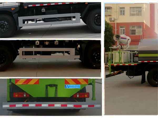 專用裝置為抑塵霧炮,用于城市抑塵,整車長度/軸距的對應關系為(mm):7700/3950,7950/4200,8250/4500,8450/4700,8850/5100,9350/5600;側防護及后下部防護裝置均采用Q235A材質(zhì),均采用焊接連接,后下部防護尺寸:120×50(mm),離地面高度500mm.ABS型號及生產(chǎn)廠家為:3631010-C2000/東科克諾爾商用車制動系統(tǒng)(十堰)有限公司,J ABS/焦作博瑞克控制技術有限公司.當整備質(zhì)量為(kg):6680時,軸距為(mm):3950,4200,4500,當整備質(zhì)量為(kg):7280時,軸距為(mm)4700,5100,5600.