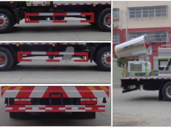 專用裝置為抑塵霧炮,用于城市抑塵.整車長/軸距/后懸對應關系為(mm):8960/3950/2500;9750/4500/2740;9950/4700/2740,10250/5000/2740,10550/5300/2740,10850/5600/2740.此車后伸為(mm):1250.防護材料:Q235A碳鋼,連接方式:左右側面采用焊接連接,后下部防護采用螺栓連接,后部防護斷面尺寸(mm):150×50,后部防護離地高度(mm):450.ABS系統生產廠家,型號 :焦作博瑞克控制技術有限公司,J ABS.當軸距為(3950mm,4500mm,4700mm)時,整備質量為9980kg,當軸距為|(5000mm,5300mm,5600mm)時,整備質量為10500kg.選裝霧炮圖片.