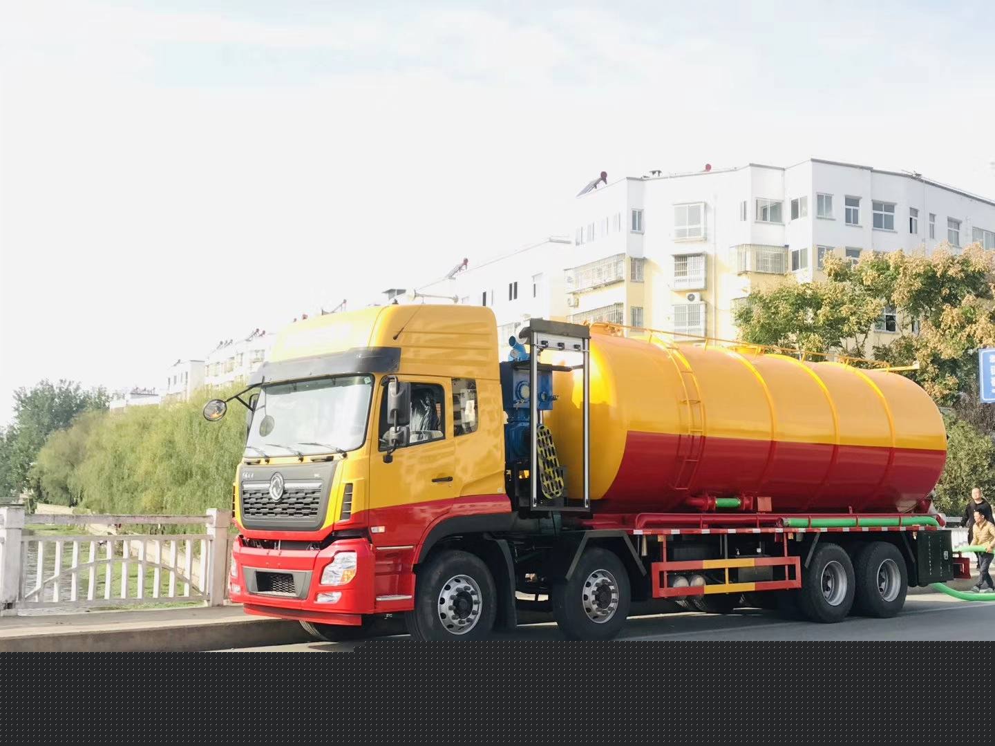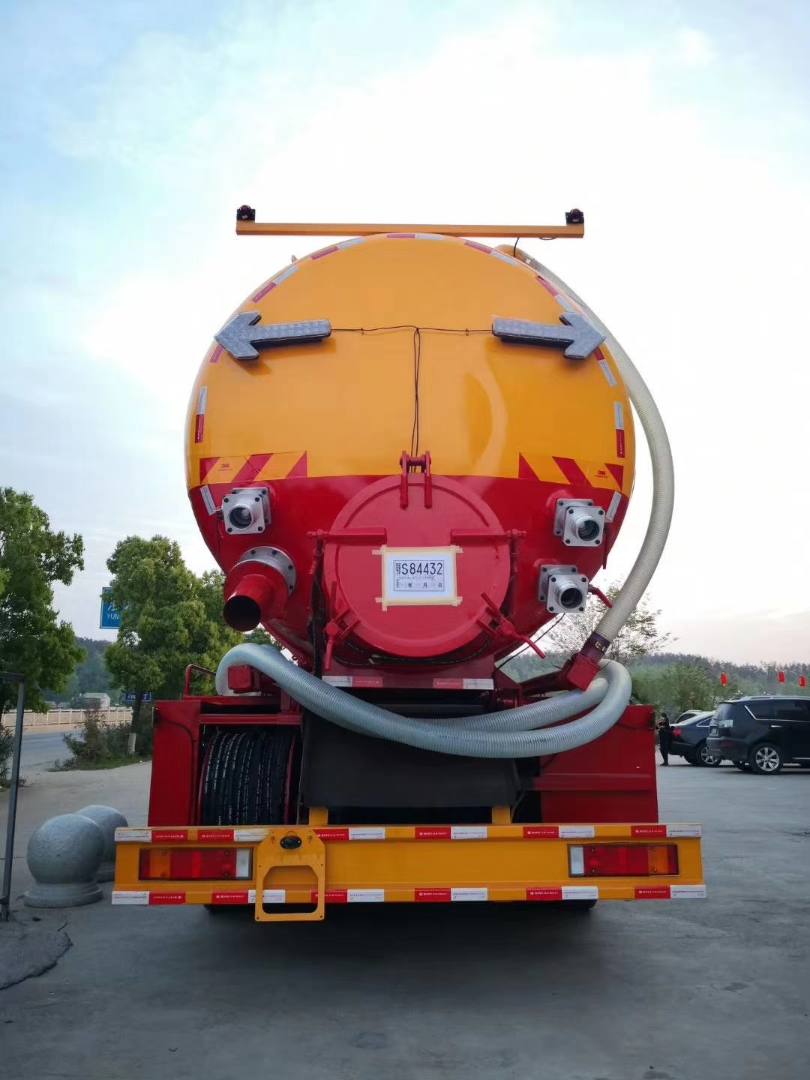 8mm碳鋼板材,封頭8mm厚,清水約5方左右,污水30方左右,兩倉互通.罐體頂部防滑平臺,底部安裝4寸排水閥1個.污水罐用水泥罐口1個.高壓部分采用德國品浮330L高壓泵.泵出口到絞盤高壓管采用32MM通徑,帶氣吹.量管一根,防栓接口.頂部另安裝50圓閥門當呼氣閥。后封頭可旋轉收放液壓絞盤,高壓管100米25高壓管。污水部分采用420馬力副發配備258水循環泵。清水罐污水罐副駕一側用4寸球閥互通(水箱為不銹鋼).清水罐爬梯一個,視糞窗。后封頭下部800mm內徑液壓開啟排污口,罐蓋左下按裝一個6寸不銹鋼排污閥1個,4寸排污閥1個,后蓋右上4寸吸污閥1個.后蓋右下4寸吸污閥1個,副駕一側吸污管采用無縫鋼管,配4寸吸污閥.帶一根10米吸污管。左右兩側平臺用4MM碳鋼板材.副駕右側尾部加裝6寸邊排一個.一個雙層工具箱,高壓泵進出管用89MM管.尾部安裝箭頭燈.