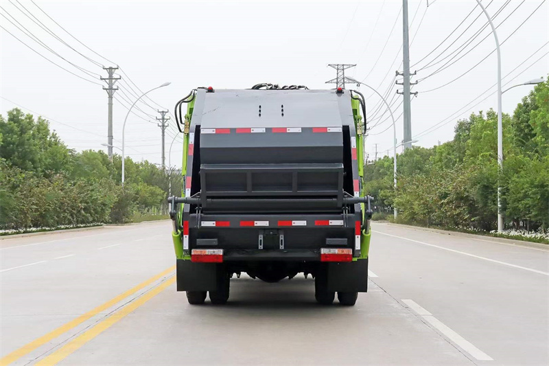 上裝配置:整車上裝采用Q345高強度錳鋼制作,容積約8立方,新式可破碎刮板,中置及后置污水箱,雙向蠕動壓縮,國內知名品牌液壓系統(合肥泵,中梅閥,嘉善取力器,國產油缸),駕駛室內及車身外集中電控(PLC),尾部翻轉桶機構(可同時翻轉兩個240L國標方形塑料垃圾桶),氣控密封蓋,駕駛室內一鍵循環,司機可不下車完成完成卸料工作。