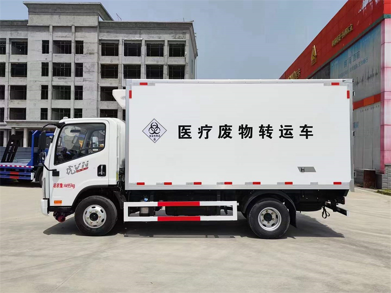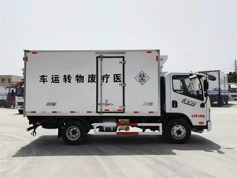 解放虎V藍牌醫療廢物運輸車,虎v駕駛室,CA4DB1-13E6 (錫柴130馬力),6TS40B   萬里揚6檔,1058沖焊橋(5T)   速比4.875,700R16 真空胎,多功能方向盤,空調+電動門窗+中控鎖,120L油箱,后處理器前置+排氣火花熄滅器+前盤后鼓制動器+限速79KM/H,北斗+GPRS行車記錄儀,爆胎應急安全裝置,帶靜電拖地帶,LDW+FCW。原廠危險品專用底盤。廂體采用304不銹鋼制作。
