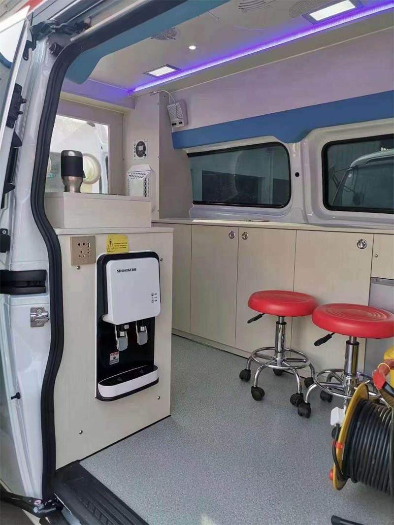 程力救護車廠生產的福特V362核酸取樣車準備出戰開平,核酸取樣車配備空調、正壓新風系統、60秒內完成核酸檢測部署。