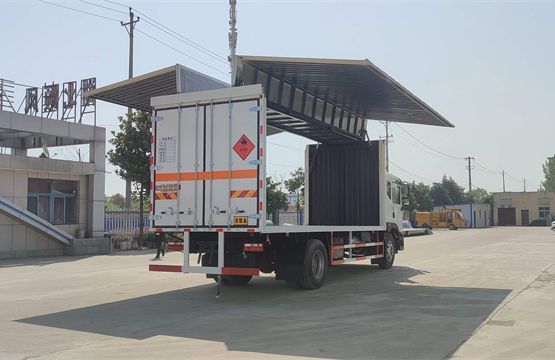 翼展危險品運輸車上裝配置:外板采用免漆板有一次性沖壓成型的百葉窗,內飾為導電性能良好的合金板有透氣孔,復合加鉚合工藝,內襯為矩形管骨架牢靠穩定,骨架內部填充為透氣防潮阻燃材料。廂體外部四周鋁合金型材包邊,底板和車廂前下部鋪橡膠皮,后門雙開,右側單開側門,內部裝固定貨物的臥環,安裝煙霧報警器、防盜感應器。車身附件靜電接地帶、滅火器、防火罩、危險品三角燈、橙色反光帶、CCC反射器、菱形標志牌、危險品牌、安全告示齊全。