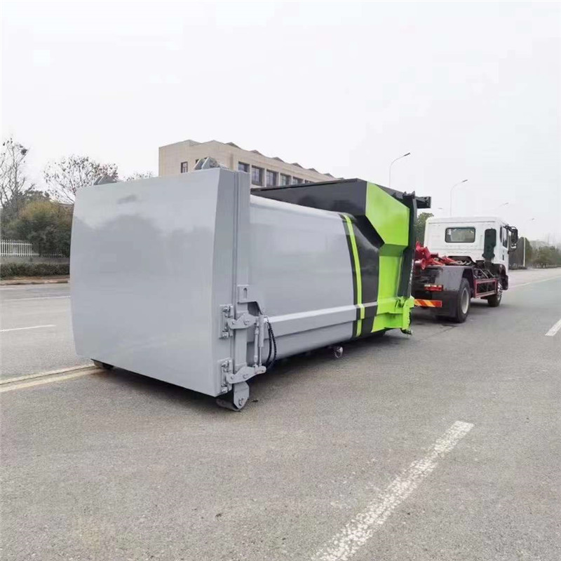 程力廠家12方移動壓縮垃圾箱,搭配東風4500mm軸距D9勾臂車使用,箱體采用Q345高強度錳鋼板焊接而成,箱體內腔無骨架圓弧曲線設計,外形美觀,科學合理,鴻輝動力單元、液壓油缸,PLC電控系統(tǒng),電子顯示屏,可直觀顯示箱體壓滿程度及故障診斷,操作簡單便捷,后門液壓鎖緊無泄漏避免垃圾二次污染。可移動10噸垃圾箱