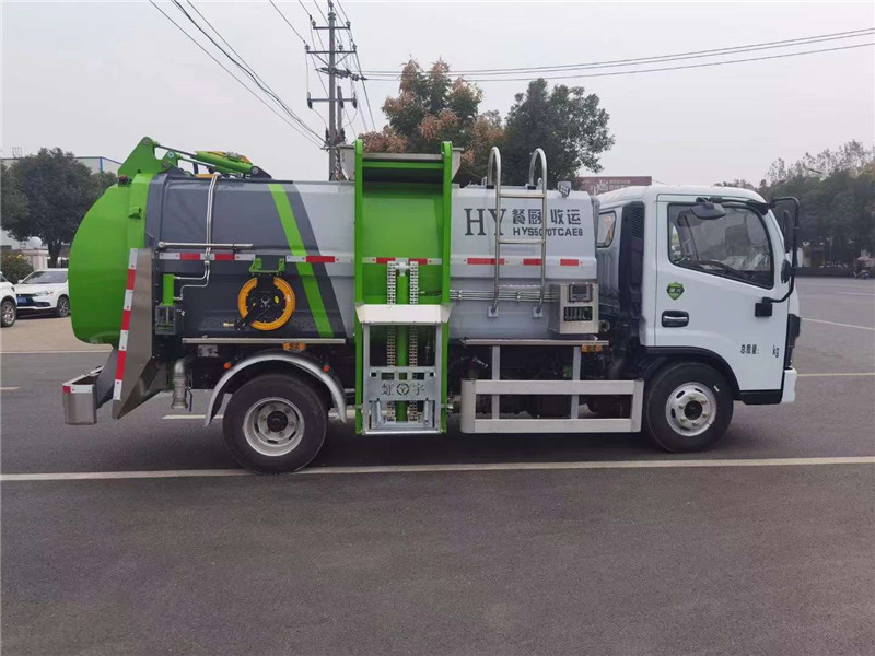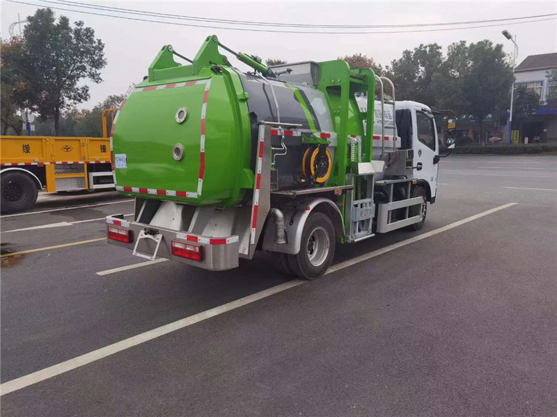 程力專汽東風多利卡6方餐廚垃圾車,罐體容積6方,方形箱體,材料采用優質Q235碳鋼板材,進口海德液壓閥組,干濕分離功能,帶清洗功能,側掛標準120L/240L塑料垃圾桶,進料口蓋氣動開關,液壓后蓋。箱體內部帶液壓推鏟卸料(不帶舉升功能),作業照明燈,不銹鋼進料口,鋁合金側防護,不銹鋼推板,不銹鋼干濕分離。
