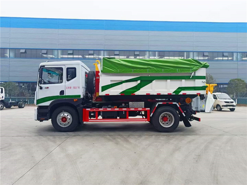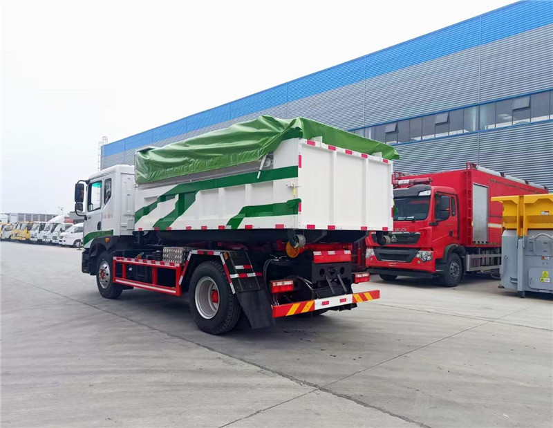程力汽車研發(fā)的新款東風(fēng)D9建筑勾臂垃圾車帶電動(dòng)雨篷。工地專用建筑垃圾車。