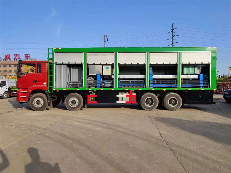 車箱頂部活動扣板便于板框壓濾機操作,注料泵37kw,前面2立方304不銹鋼拌藥箱雙攪拌,500升304不銹鋼絮凝槽,配電柜可外接電源。 抽污運行系統:11kw泥漿泵,1.1千瓦加水泵,1.5千瓦加藥泵,過濾出來的水可通過加水泵抽到拌藥箱、清水箱循環利用,吸污管4根,每根6米,每小時可壓泥餅4立方左右,泥餅含水量60%左右。泥漿處理車價格電詢或面議。